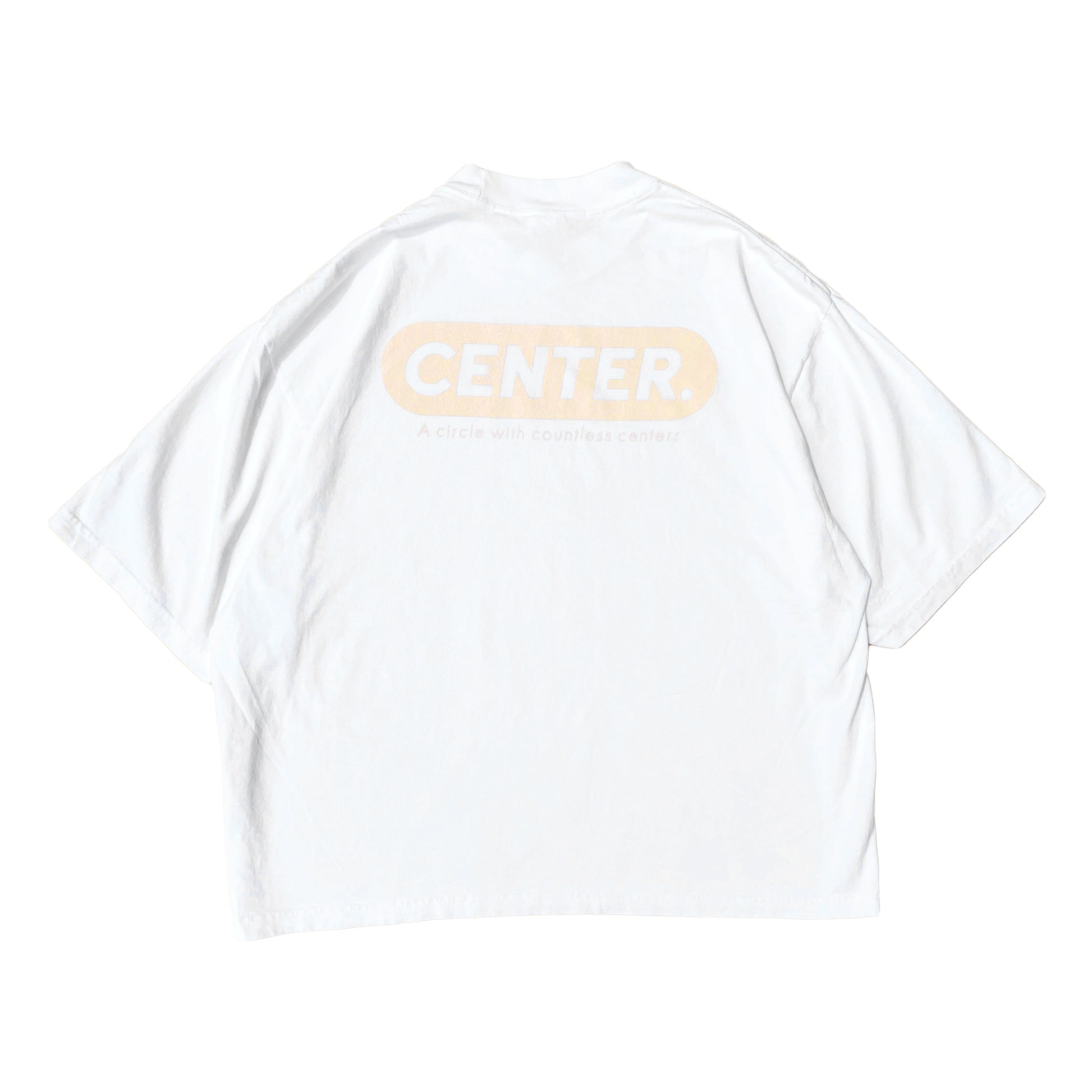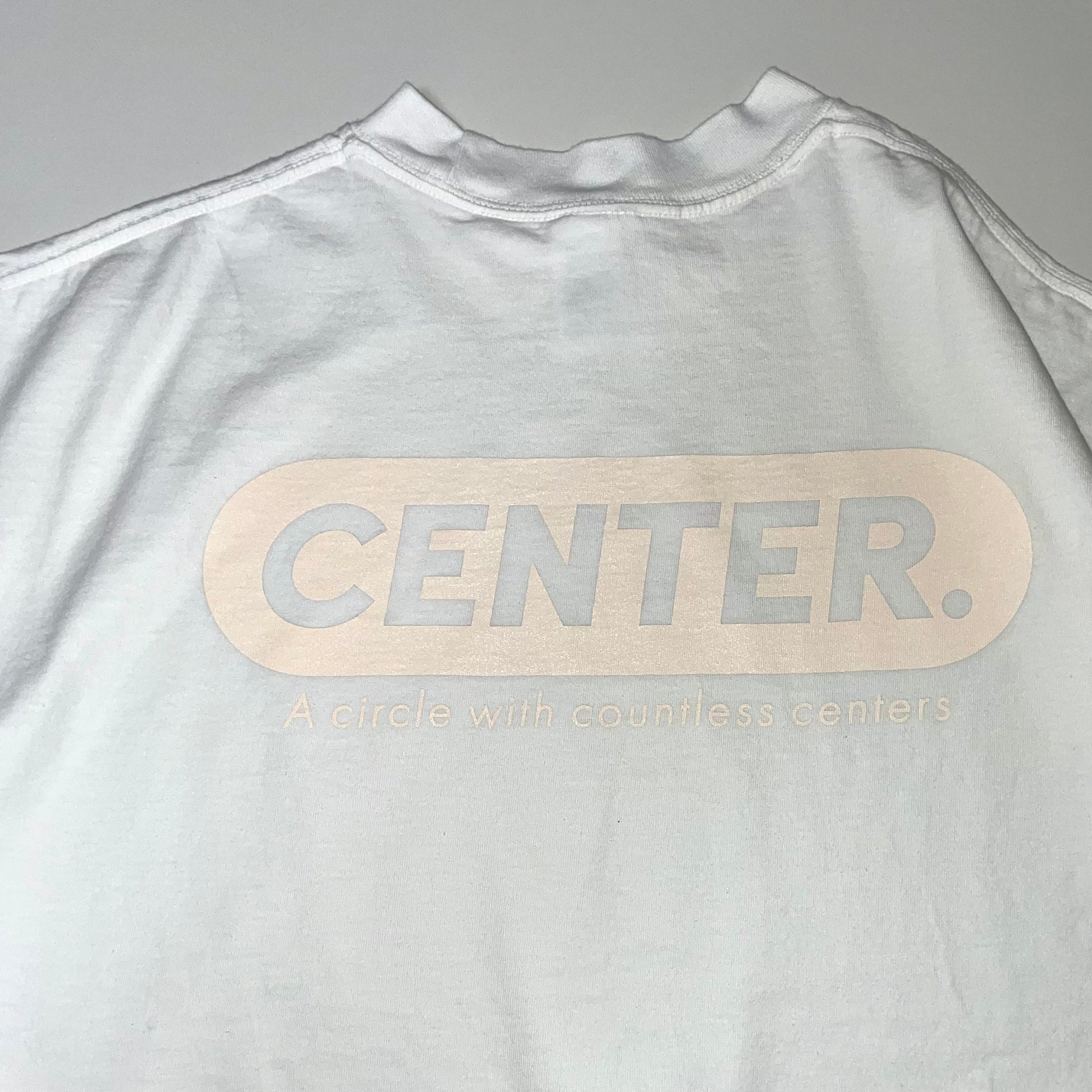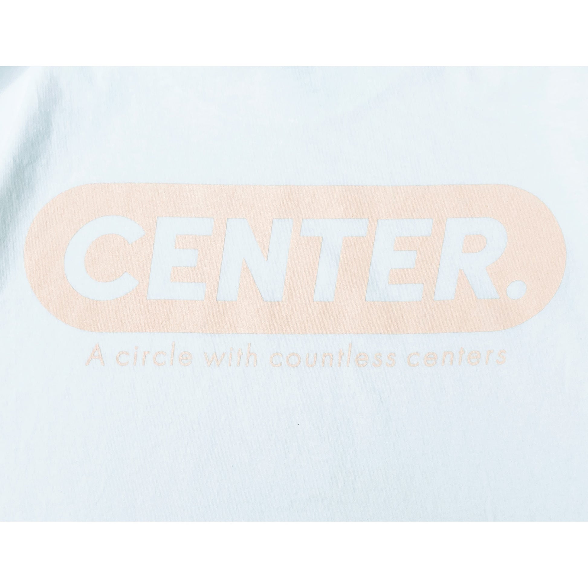 いつも襟元タグとして刷っているカプセル型のロゴをバックにプリントしました。その下には、ブランド名を【CENTER.】と名付けるきっかけの一つにもなった「無数の中心が在る円」というCream的な言葉が添えられています。