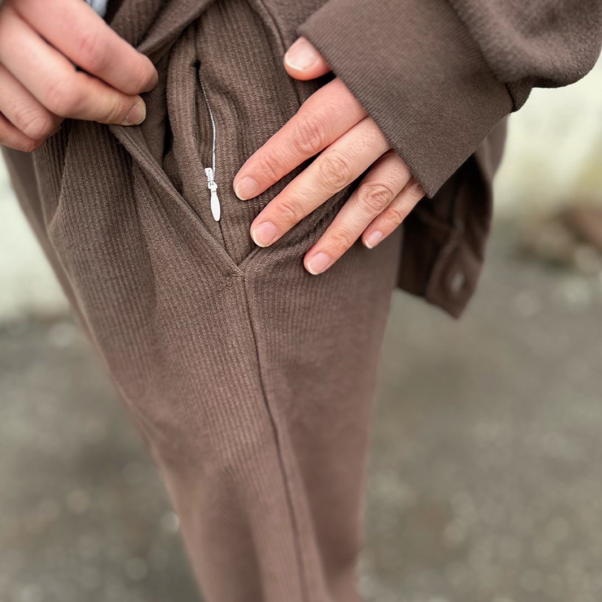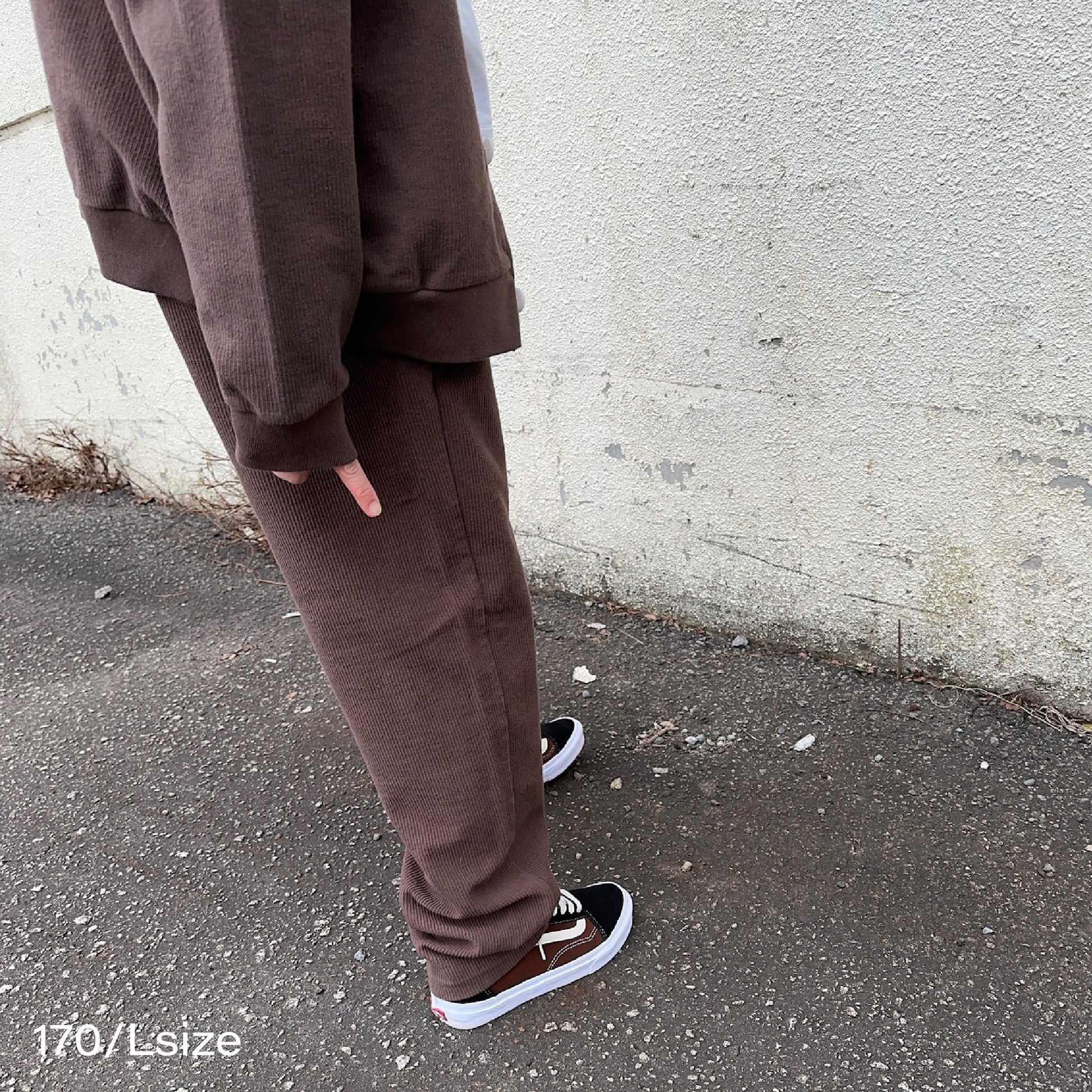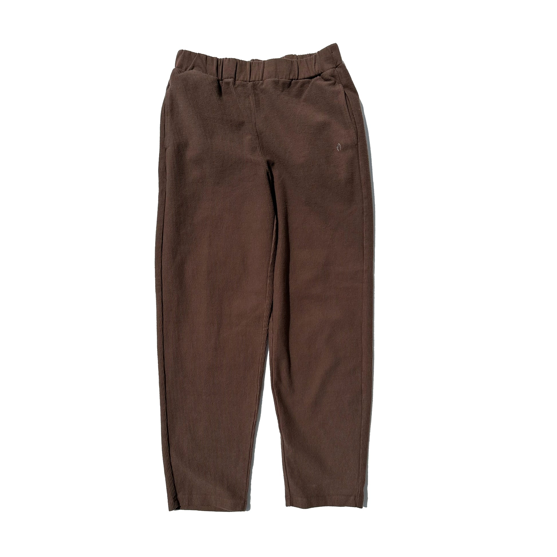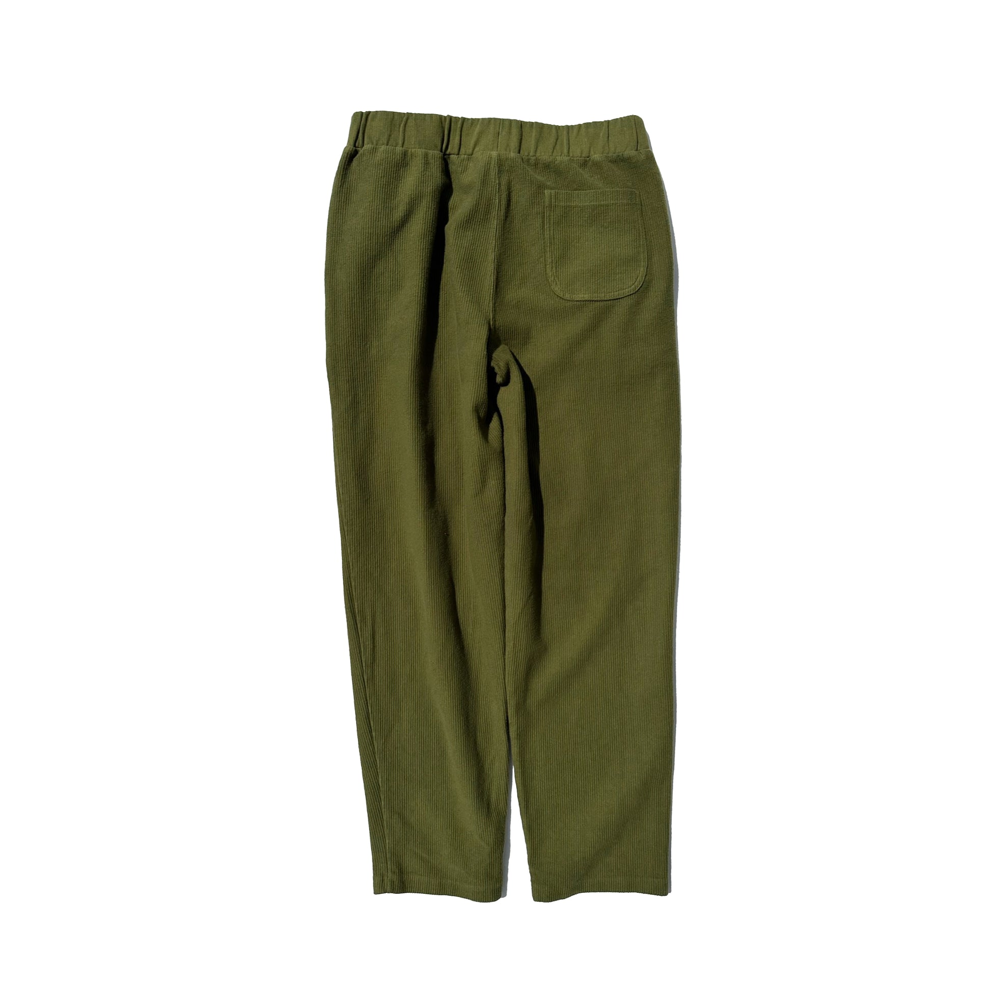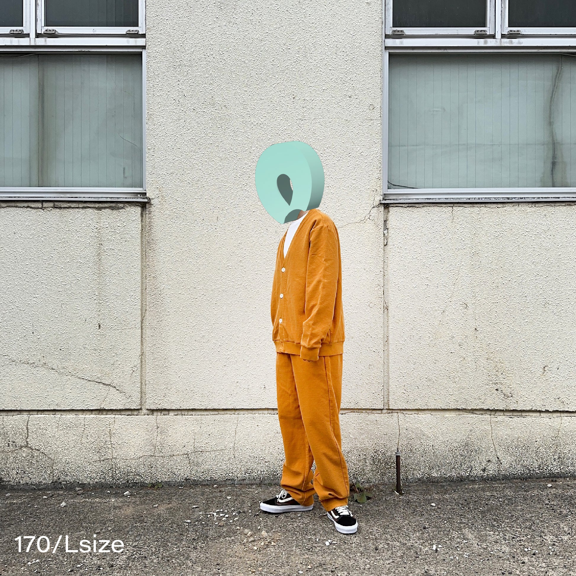 左ポケット付近にブランドシンボルを刺繍。ボディはロサンゼルスのブランクアパレルメーカーの別注カラーです。コットン100%。表はコーデュロイ、裏はスウェットのような感じです。 15ozと重めですがコットン素材なので肌触りも良く、サラッとした着心地です。ルーズフィットなシルエットでテーパーがかっており裾のたまりがとてもきれいです。ウエストはドローコードで調節可能です。同色のCotton Corduroy Cardiganとのセットアップもお勧めです。