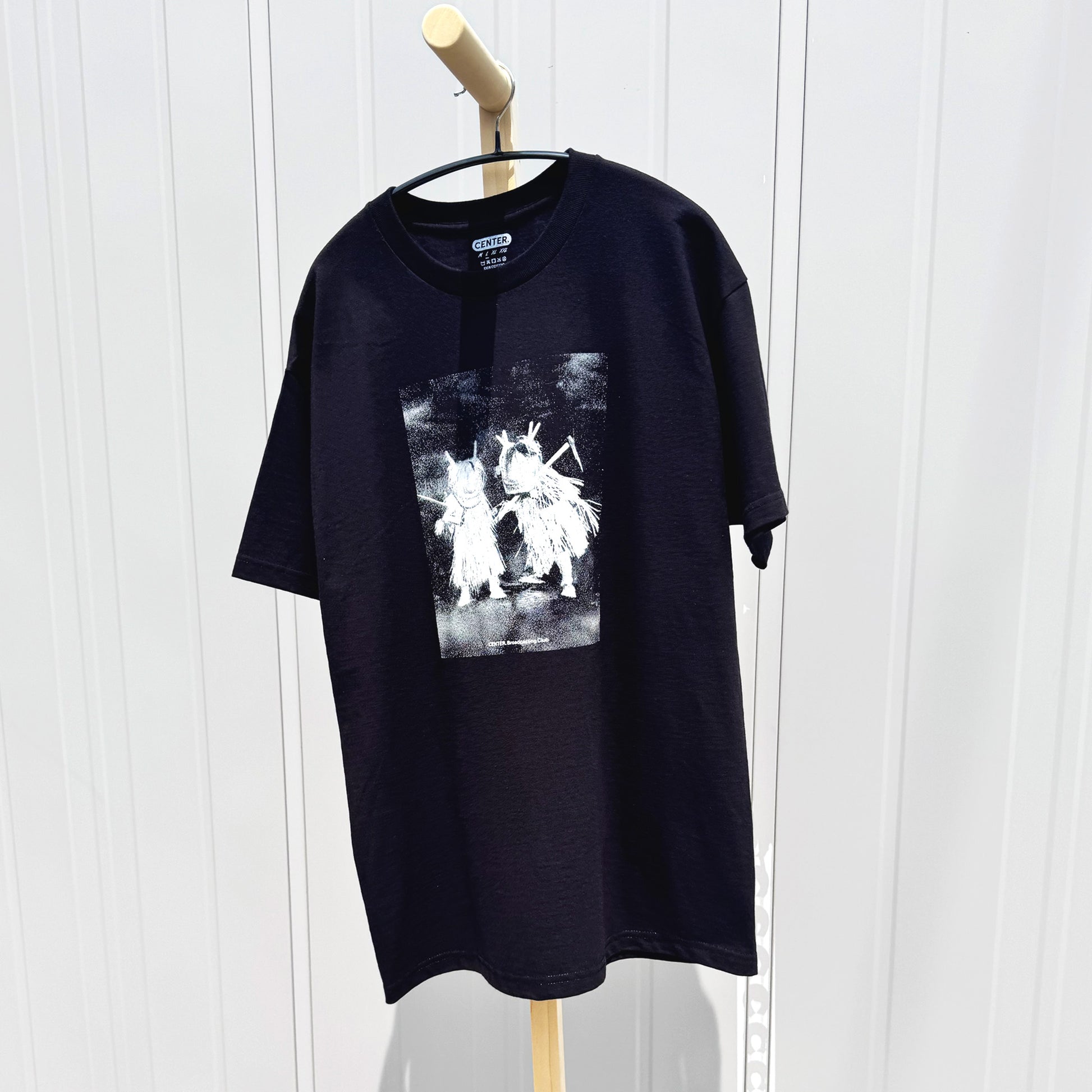 鍬と出刃包丁を持った使者が闇に佇む渋いフォトグラフTeeです。