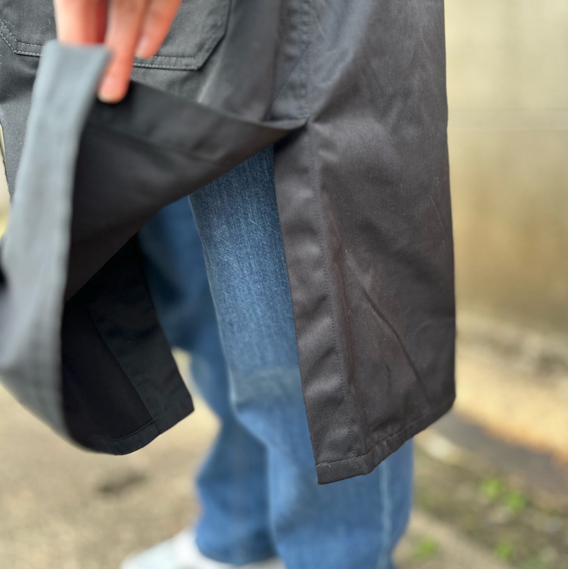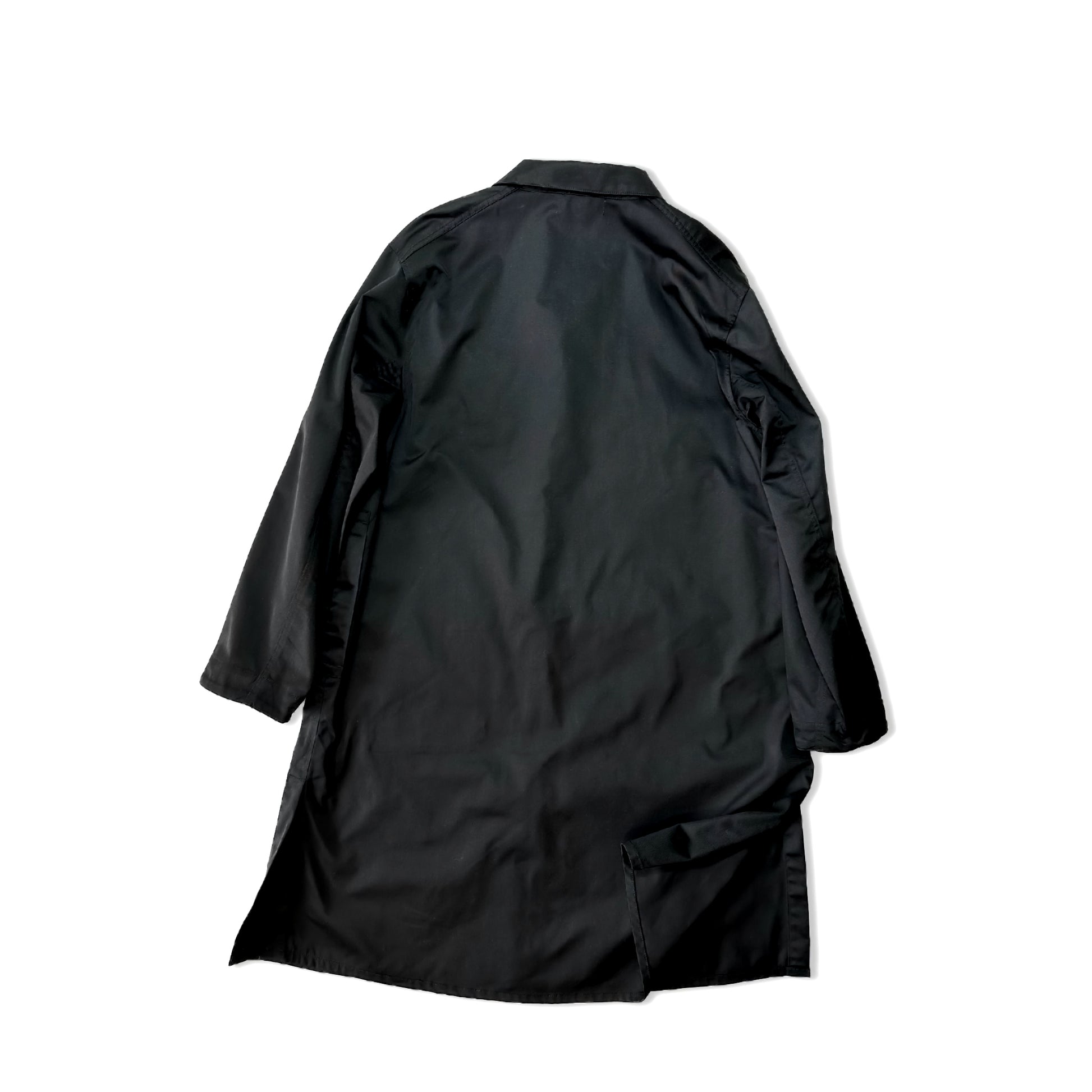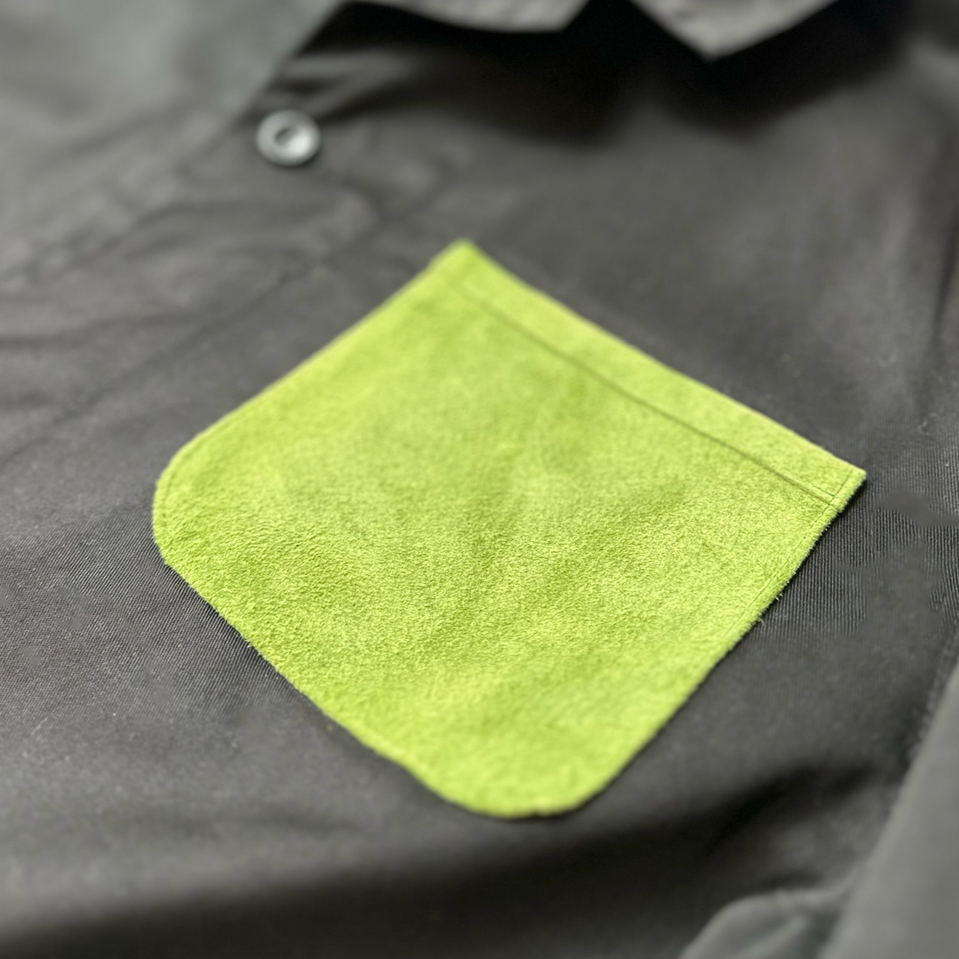 ベーシックなショップコートにスウェードレザーの胸ポケットが特別感を醸し出してます。程よい光沢でシワになりにくいツイル生地。可動性を高めるサイドベンツやスルーポケットなどショップコートならではの仕様。ゆったりとした作りでこの時期サクッと羽織れる一枚仕立て。